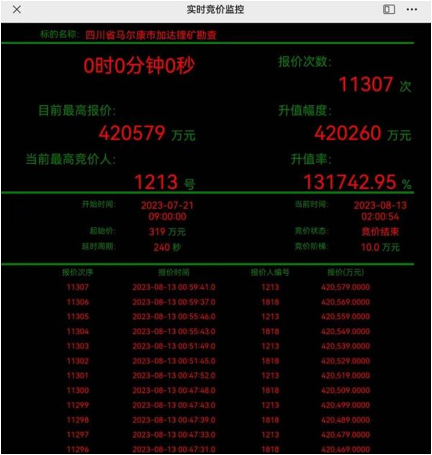 值得注意的是,三天前(8月11日),四川能投資本控股有限公司以10.1億元的價格拍得四川省金川縣李家溝北鋰礦探礦權(quán)。該筆競價交易同樣鏖戰(zhàn)2天,報價次數(shù)3412次,較57萬元起拍價升值超1771倍。