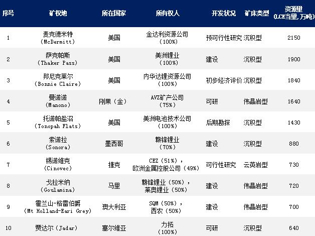 根據(jù)總資源量(LCE,碳酸鋰當(dāng)量,萬噸,以下同),Mining Intelligence網(wǎng)站列出了世界前十大粘土和硬巖鋰礦。