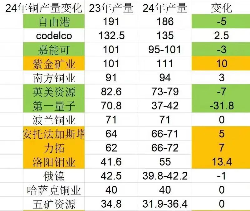 智利國家銅業(yè)公司、南方銅業(yè)公司、波蘭國家銅業(yè)集團、哈薩克銅業(yè)、淡水河谷均有小幅增長預期或與2023年保持不變。